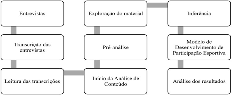 Os conteúdos verbais transcritos foram analisados a partir da Análise de Conteúdo proposta por Bardin16, a partir das três etapas: 1) pré-análise: as transcrições foram lidas de modo flutuante para a produção e a formulação de temas para as posteriores discussões e elaborações de hipóteses; 2) exploração do material: os dados foram codificados e estabeleceu-se categorias (neste estudo foram adotadas à priori “iniciação” e “especialização”), nas quais foram definidos os temas de registros e das unidades de contexto (segmentos da mensagem que refletem os significados encontrados nos temas de registro); 3) inferência: diz respeito aos polos de análises nas quais podem ocorrer à análise de conteúdo. Os resultados foram discutidos a partir da interlocução com o Modelo de Desenvolvimento de Participação Esportiva6, considerado como pano de fundo para a análise. Na Figura 1 está apresentado o fluxograma desde a realização das entrevistas até a análise dos resultados.