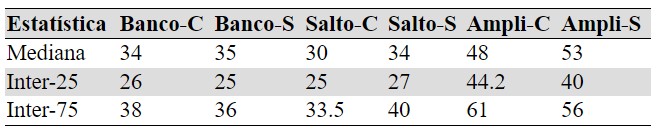 Os dados estão em forma de mediana e intervalo interquartil(Inter); Banco de wells em centímetros (Banco); Salto vertical em centímetros (Salto); Amplitude articular em graus (Amplitude); com liberação miofascial (C) e sem liberação miofascial (S).