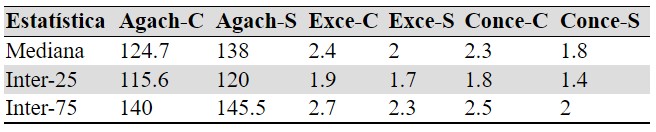 Os dados estão em forma de mediana e intervalo interquartil (Inter); Agachamento em quilos (Agach); Contração Excêntrica em segundos (Exce); Contração Concêntrica em segundos (Conce); com liberação miofascial (C) e sem liberação miofascial (S).